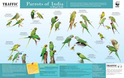 New Delhi, India, 15th February 2012—A parrot in captivity is one of the more visible symbols of illegal trade in India, where all native wildlife is fully protected. To help enforcement officers identify the 12 native parrot species, and thereby clip the wings of the illegal bird trade, TRAFFIC India with support from WWF-India has produced an identification poster entitled “Parrots of India in Illegal Trade.”