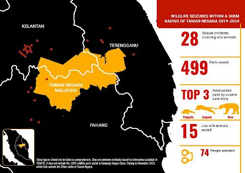 According to TRAFFIC data, there have been at least 28 known seizure incidents involving wild animals within a 30 km radius of Taman Negara in the past five years. These incidents have led to at least 74 arrests. Most recently a Vietnamese poacher caught inside the park with 54 leopard parts, weapons, and tools, was sentenced to six years in prison.
