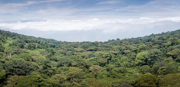 Mountain gorilla Gorilla beringei beringei silverback watching through forest, Virunga Mountains © naturepl.com / Andy Rouse / WWF
